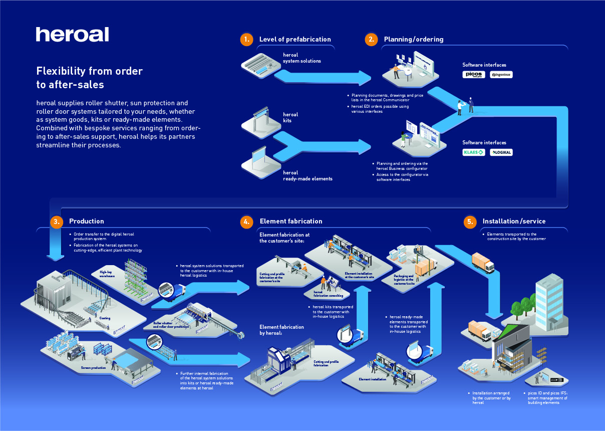 Les solutions système heroal sont fabriquées sur des installations ultramodernes et performantes. Grâce à son installation de revêtement par poudre interne, à une ligne de profilage ultramoderne, à une installation de fabrication de tabliers ainsi qu’à sa nouvelle unité de production interne de toiles pour stores textiles, heroal dispose d’une forte intégration verticale et crée les conditions idéales pour une qualité exceptionnelle et une liberté de conception maximale. À cela s’ajoutent un département dédié au cintrage de profilés et à l’usinage de tôles sur mesure, ainsi qu’un contrôle qualité entièrement automatisé. Des processus efficaces au sein du centre logistique moderne et la livraison au client par la flotte de camions heroal garantissent en outre une livraison fiable et rapide.