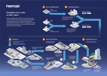 La gamme de services heroal Ready permet un gain de temps maximal grâce à des éléments préfabriqués composés de composants heroal certifiés, destinés aux systèmes de volets roulants, de protection solaire et de portes de garage. Ces éléments peuvent être transportés sur le chantier et montés sur place par le partenaire spécialisé heroal sans nécessiter de traitement supplémentaire.